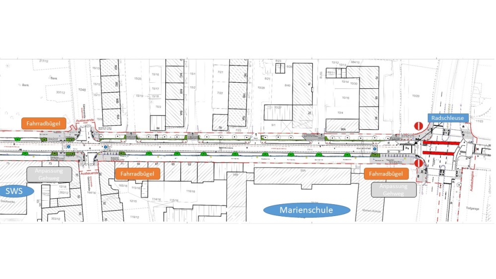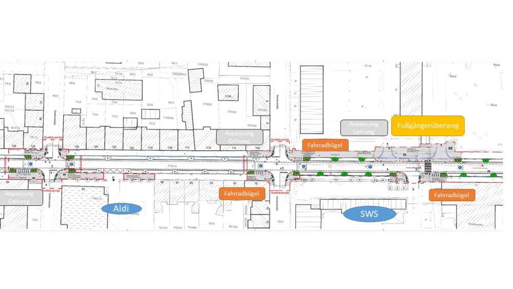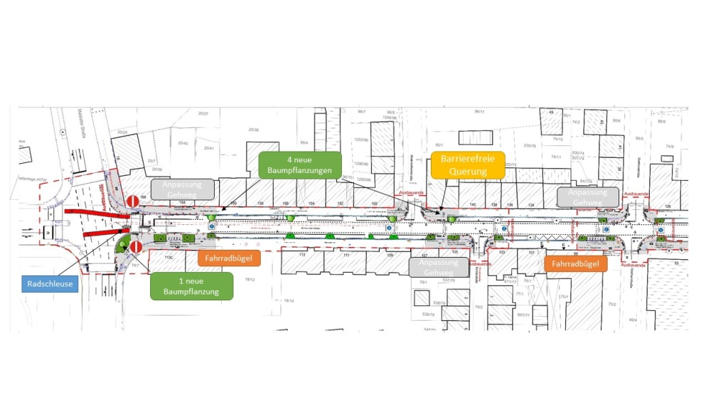 Zusätzlich werden abschnittsweise Gehwege und Baumeinfassungen instandgesetzt und ein Teil der Straßenbeleuchtung wird erneuert.
