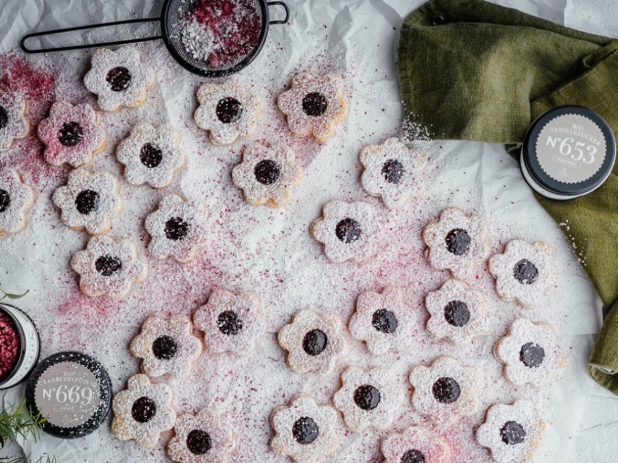 • Puderzucker und Cranberrypulver mischen und die Spitzbuben großzügig damit bestäuben.