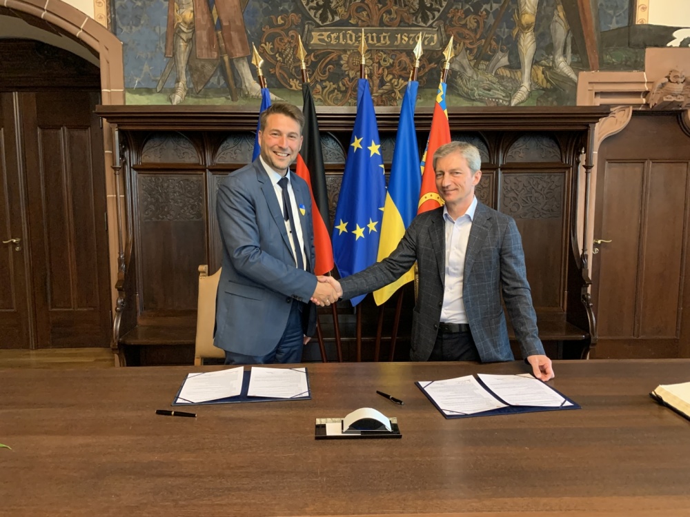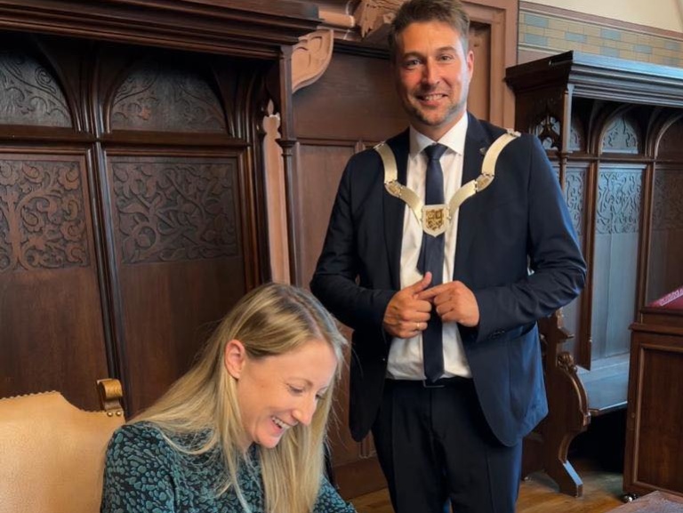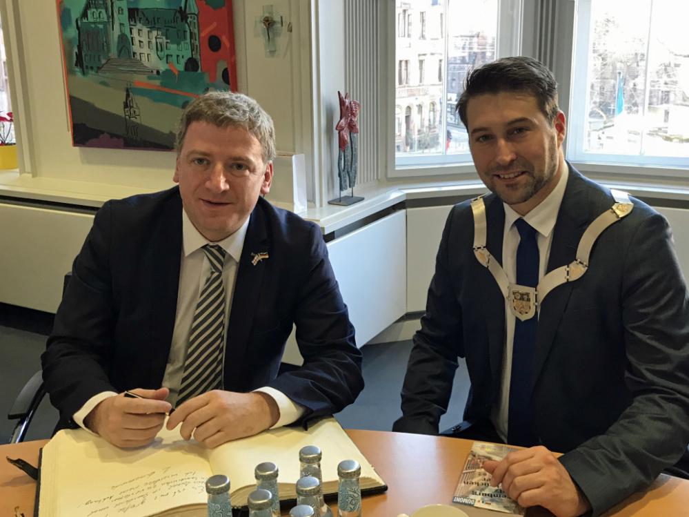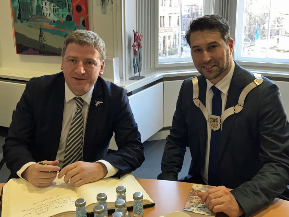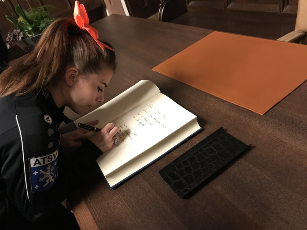 Oberbürgermeister Uwe Conradt lädt kulturelle und gesellschaftliche Gäste der Landeshauptstadt dazu ein, sich in das Gästebuch der Landeshauptstadt einzutragen.