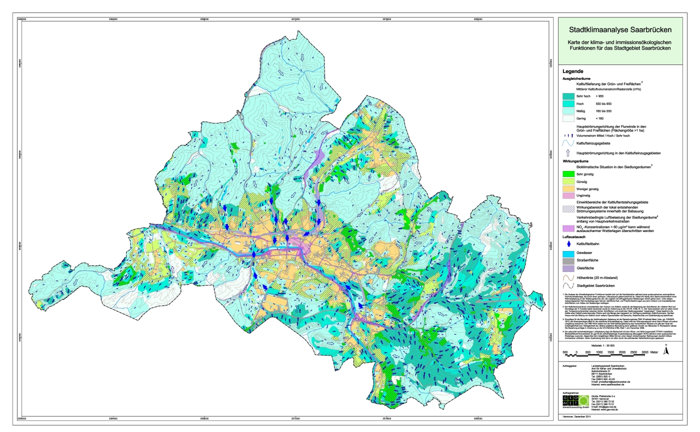 Die Betrachtung klimatischer Auswirkungen von städtebaulichen Projekten gewinnt vor dem Hintergrund des Klimawandels zunehmend an Bedeutung. Sollen künftig solche Aspekte bei der Planung und Umsetzung von Bauvorhaben stärker berücksichtigt werden, benötigt die Stadtverwaltung eine aktuelle und belastbare Datengrundlage. Mit dem neuen Kartenwerk liegt seit Anfang 2012 erstmals eine Analyse vor, die sich auf das gesamte Saarbrücker Stadtgebiet bezieht.