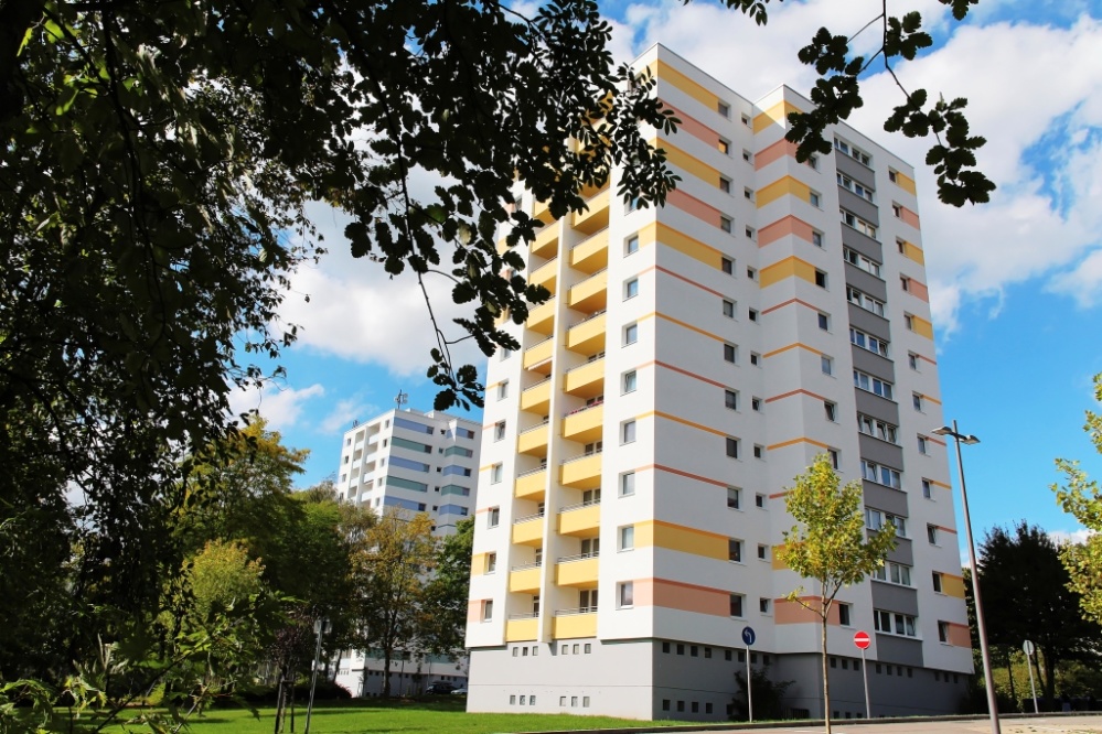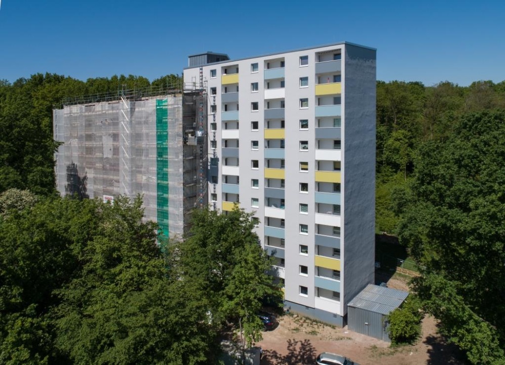 Aber auch an den zwölf sechsgeschossigen Wohnhäusern wurde vieles getan: Die Fassaden wurden gereinigt und schadhafte Stellen beseitigt, die Balkone der Dreizimmerwohnungen allesamt saniert und die Brüstungen neu gestrichen, an 72 Vierzimmer-Wohnungen wurden Balkone angebaut und zu guter Letzt wurden die Flachdächer saniert.