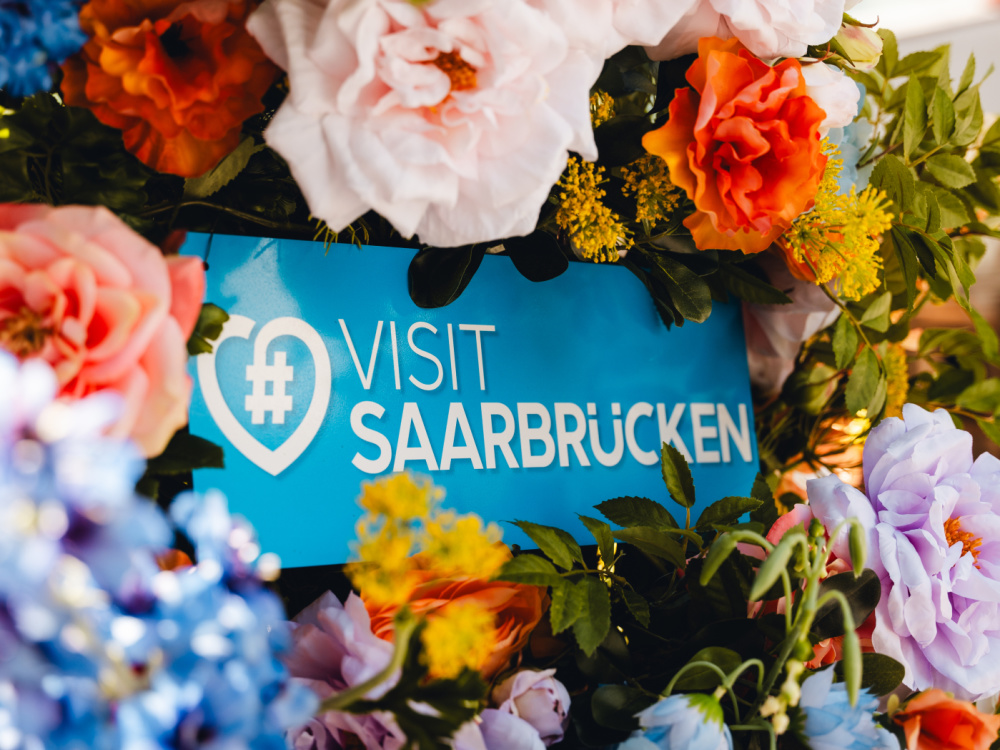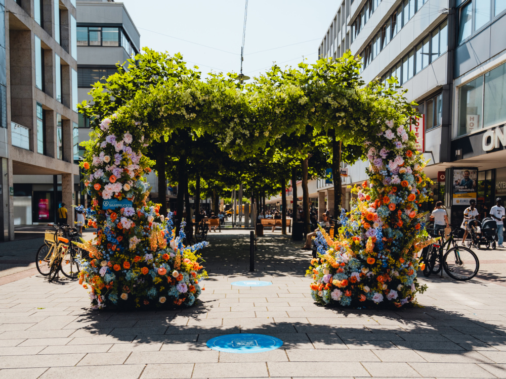 Plus de 3 400 fleurs et feuilles, aux couleurs assorties aux couleurs thématiques de Visit Sarrebruck, créent une atmosphère colorée et fleurie. Les fleurs artificielles, fabriquées à partir de ressources durables, décorent la forme en acier du cœur de Visit Saarbrücken et apportent une touche de couleur vivante dans la rue commerçante animée de la ville.